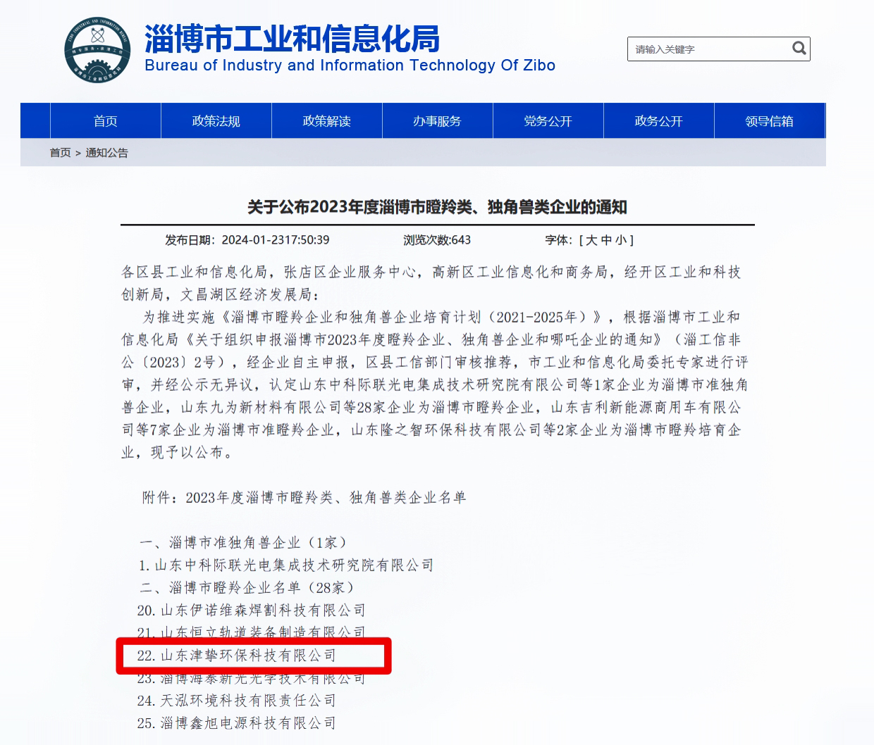 近日,淄博市工業(yè)和信息化局正式發(fā)布了2023年度淄博市瞪羚類企業(yè)名單,山東津摯環(huán)保科技有限公司(以下簡稱“津摯環(huán)保”)憑借其卓越的創(chuàng)新能力和穩(wěn)健的發(fā)展態(tài)勢成功入選!...
