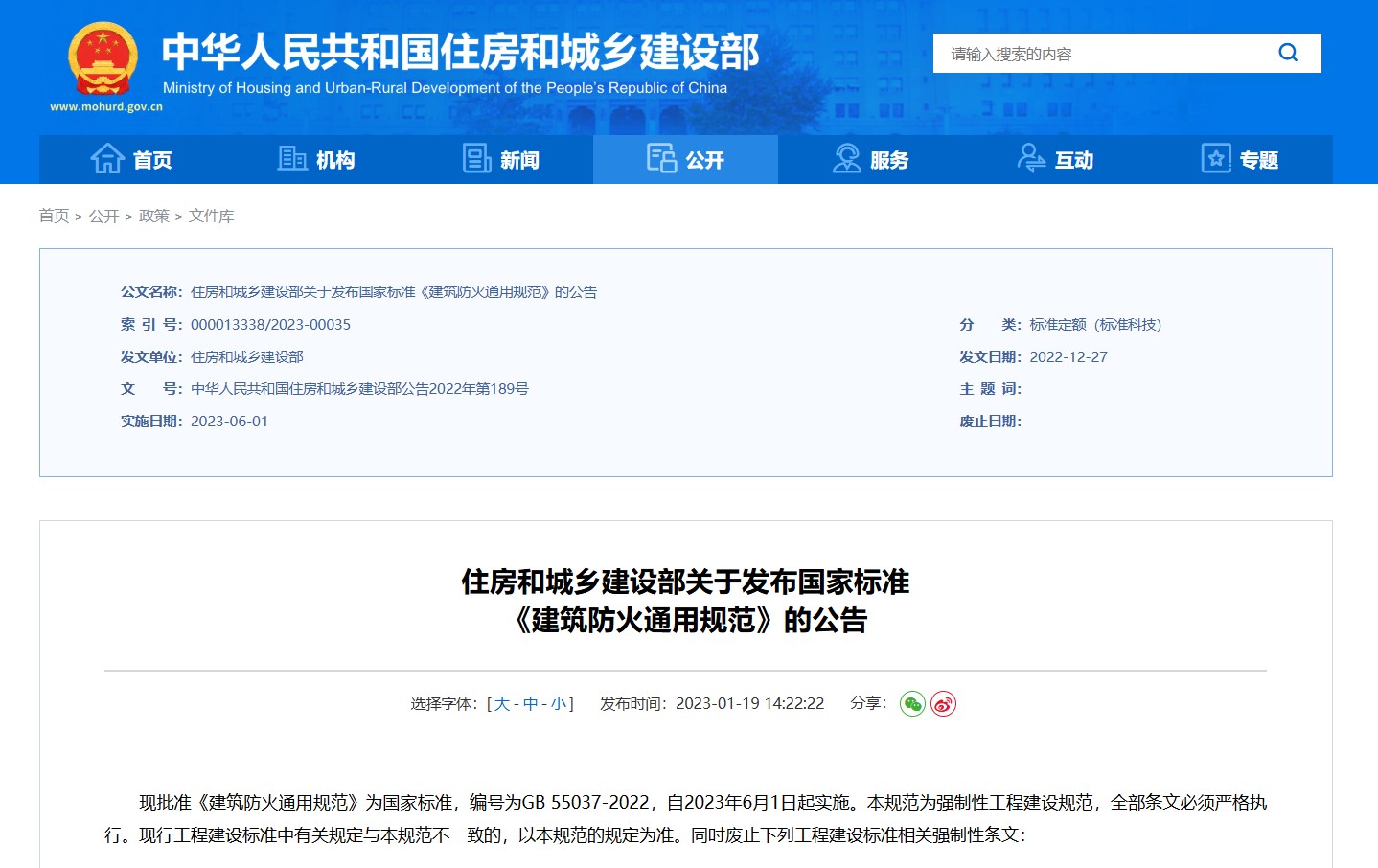 2023年1月19日,中華人民共和國住房和城鄉(xiāng)建設(shè)部公告2022年底189號文件發(fā)布,批準《建筑防火通用規(guī)范》為國家標準,編號為GB 55037-2022,自2023年6月1日起實施。本規(guī)范為強制性工程建設(shè)規(guī)范,全部條文必須嚴格執(zhí)行。