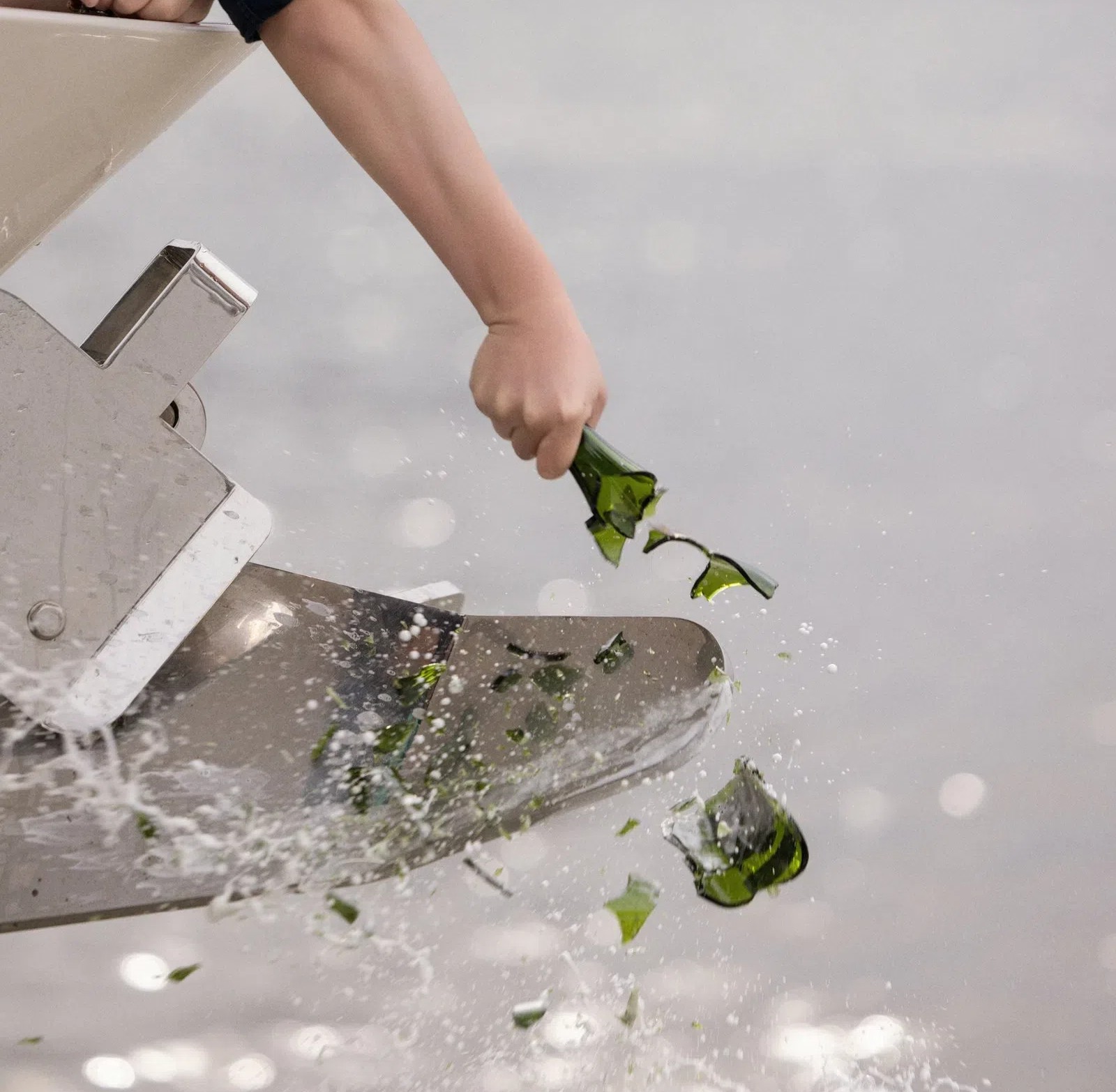 隨著游艇首次下水,儀式迎來最為激動人心的環節——“擲瓶禮”。貴賓們齊聚船首,共同參與這一歷史悠久的傳統儀式。香檳瓶在船錨被擊碎,那清脆的碎裂聲不僅預示著新船啟航的好運,也為“擲瓶禮”儀式畫上了圓滿的句號。承載著眾人的美好祝愿,“津摯壹號”揚帆起航,開啟了它輝煌的航程。